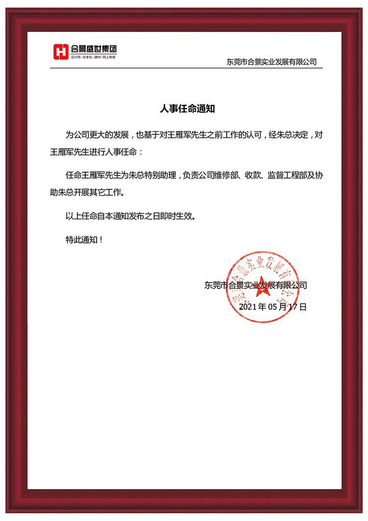 為推動(dòng)公司更大發(fā)展,經(jīng)公司綜合評(píng)估,王雁軍先生將擔(dān)任朱總特別助理,負(fù)責(zé)公司維修部、收款、監(jiān)理部及協(xié)助總經(jīng)理開展其他工作。