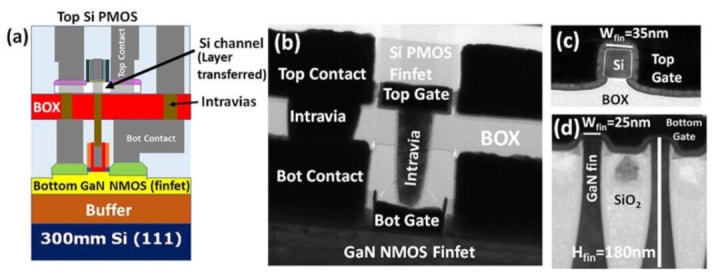 如何進行晶體管的堆疊呢?大致兩種方法,第一種就是在晶圓上通過特殊工藝將晶體管直接做成多層的;另外一種就是和傳統工藝相同的方法在晶圓上制作一層晶體管,然后將多個晶圓堆疊起來,晶圓之間通過TSV連接。關于第一種方法,目前有很多研究,例如將NMOS堆疊在PMOS上,從而節省一半的面積,使晶體管密度提升一倍。其難點在于上層的晶體管沒有致密的硅基底作為支撐,很難制作出高質量的晶體管,另外,目前的技術也只能支持兩層堆疊。
