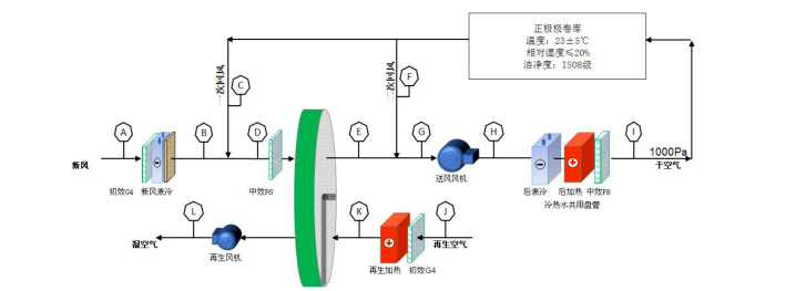 2)低濕需求空調(diào)房間,如正極輥壓間、正極分條間、正極模切間以及正極二分間等房間,其濕度控制需求為≤20%,以及正極涂布間、負(fù)極輥壓間、負(fù)極分條間、負(fù)極模切間以及負(fù)極二分間等房間,其濕度控制需求為≤45%,該需求通過冷卻除濕很難實(shí)現(xiàn),因此往往通過轉(zhuǎn)輪除濕機(jī)組處理后來滿足使用需求,機(jī)組中設(shè)置一級(jí)轉(zhuǎn)輪。
